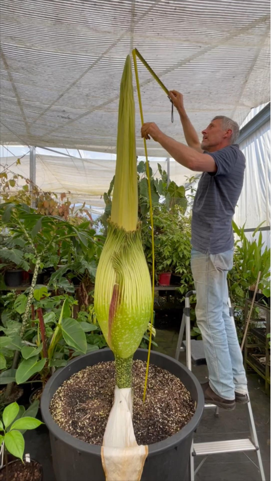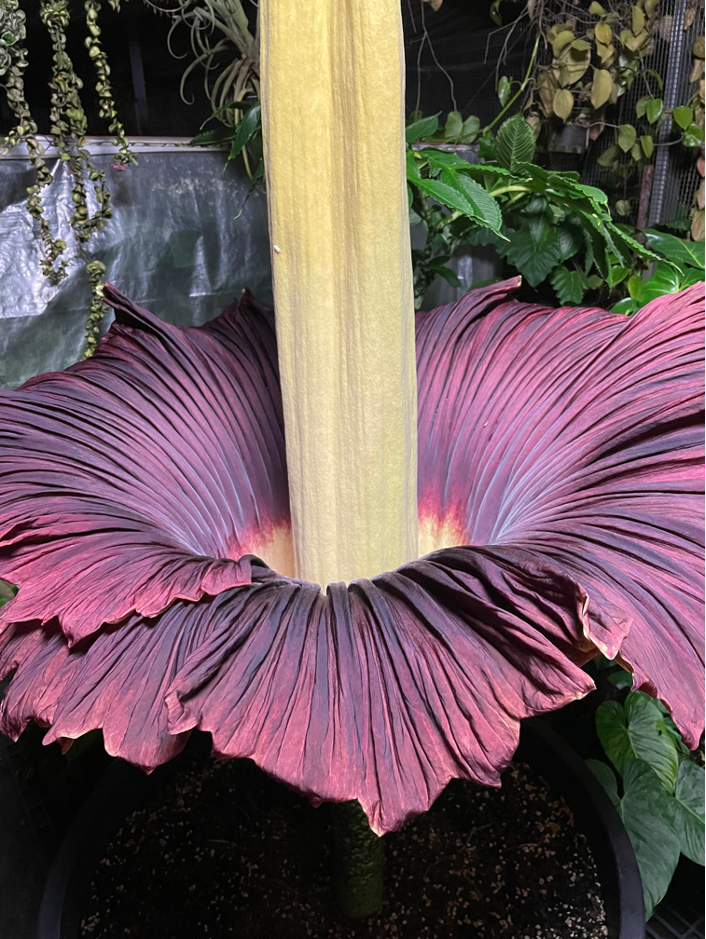 There has been much excitement in their nursery this week as their Amorphophallus titanium (corpse flower) named “Xena” (after the Warrior Princess) has flowered for the first time [January 2025].